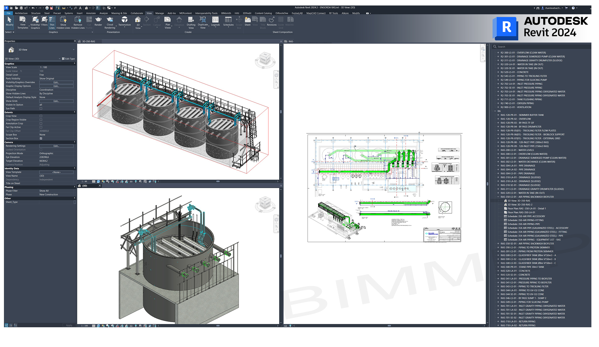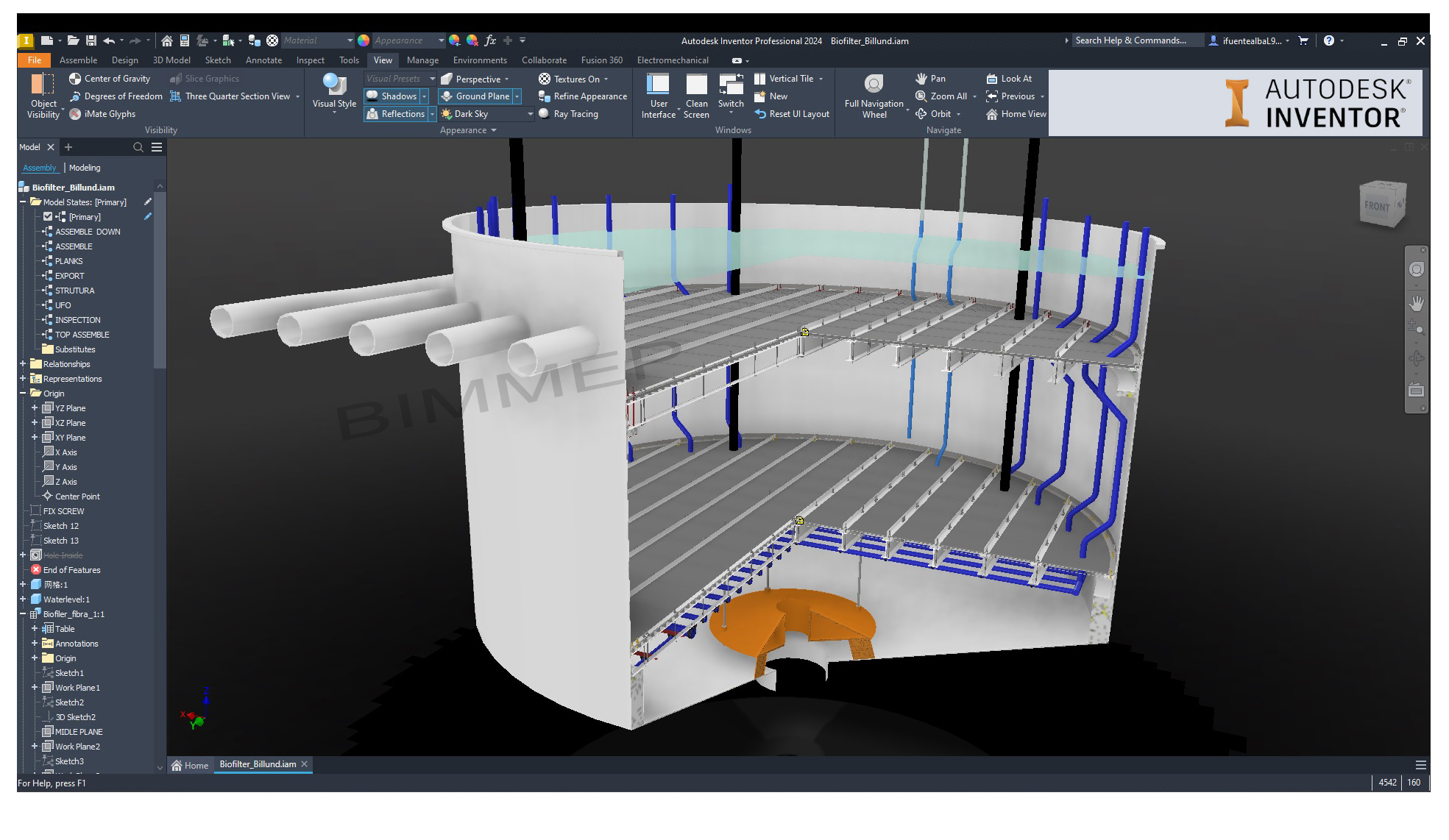 Using Autodesk Inventor and Revit, I designed the mechanical and hydraulic systems of a Biofilter (MBBR). This innovative wastewater treatment technology is used to remove contaminants and pollutants from both industrial and municipal wastewater. It applies a biological treatment process in which microorganisms grow on small plastic carriers, or biofilm media, suspended in water. These microorganisms effectively break down organic matter, ammonia, and other pollutants.